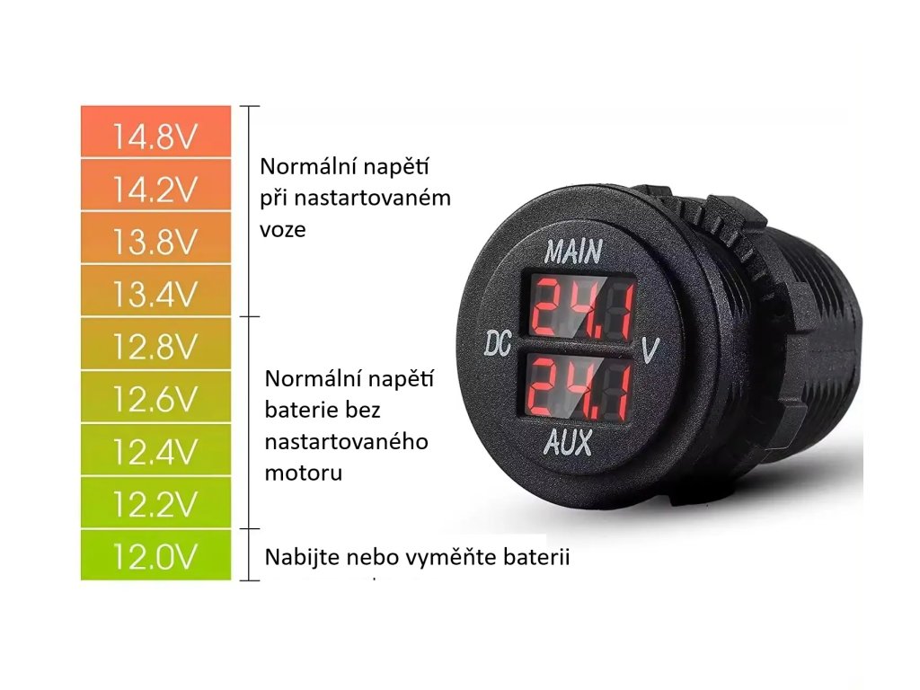 Duální voltmetr je určený ke sledování stavu 2 akumulátorů najednou, např. v obytném voze nebo jiném automobilu vybaveném 2-mi akumulátory.