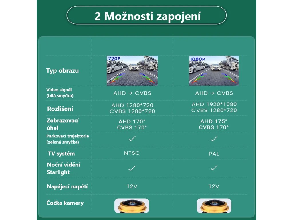 Pokud váš monitor nepodporuje video signál AHD, přestřihněte zelený vodič a změňte video signál na CVBS, znovu připojte všechny kabely (trajektorie kamery podporuje pouze video signál AHD)
