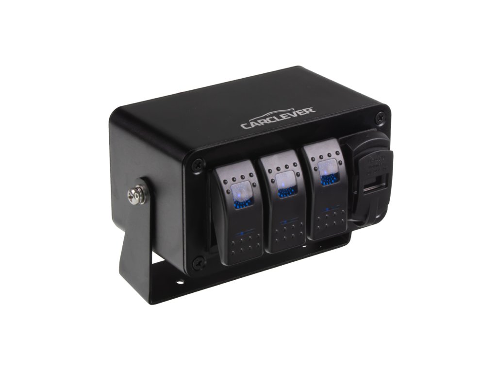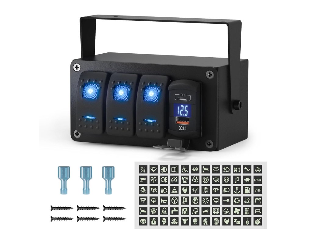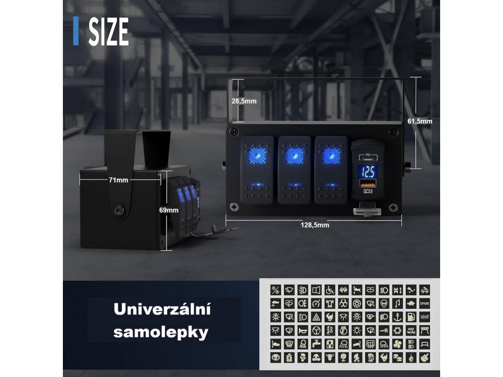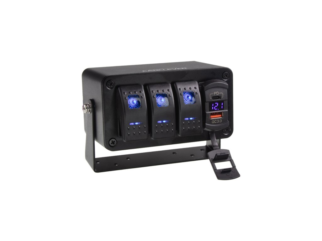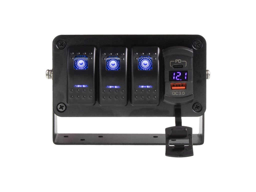 Panel (box) s 3x spínači Rocker a USB + USB-C zásuvkou s voltmetrem.
