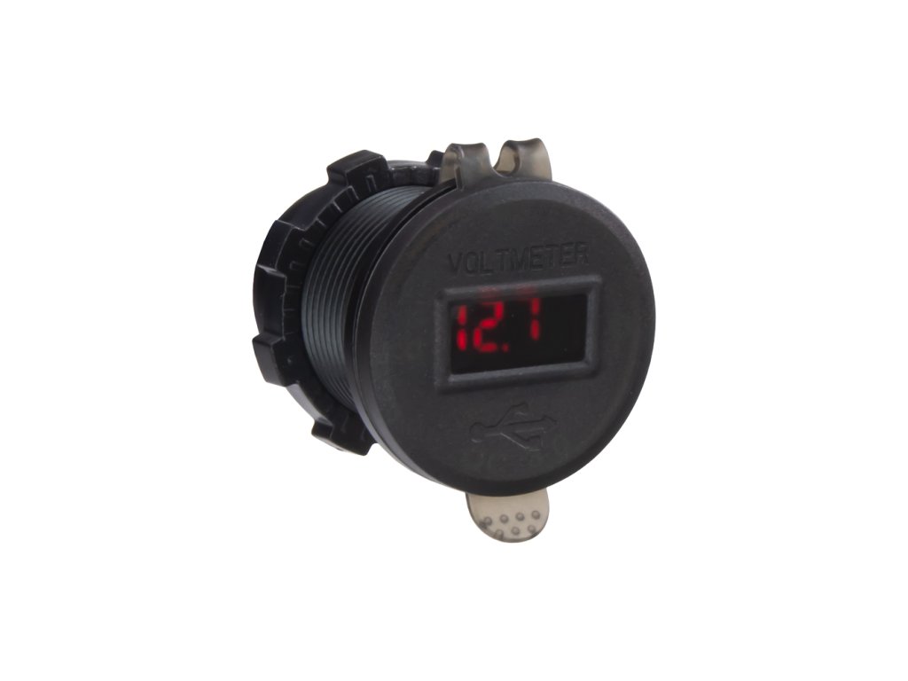 USB nabíječka QC3.0 + USB-C, s voltmetrem s krytkou proti prachu a vlhkosti, červené podsvícení.